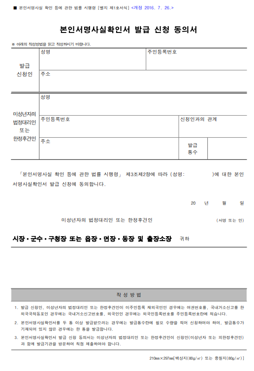 ▶ 피한정후견인의 경우 한정후견인의 동의를 필요로 하는 행위와 관련하여 본인서명사실확인서의 발급을 신청하려는경우에는 한정후견인과 함께 발급기관을 직접 방문하여 신청하되 한정후견인의 동의를 받아 신청하여야 합니다.